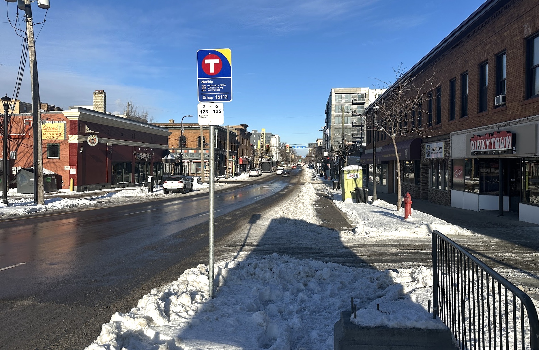 --- google-gla:gemini-2.5-flash --- subject='A snowy urban street scene' setting='A city street lined with buildings' mood='Crisp, clear, and quiet' details=['A prominent bus stop sign in the foreground', 'Piles of snow on the sidewalks and along the edges of the wet road', "Various brick buildings housing businesses like 'Andy's Old-Style Mexican Cafe' and 'DinkyTown Optical'", 'Cars driving on the wet road in the distance', 'A bright blue sky and harsh shadows indicating clear, sunny weather']